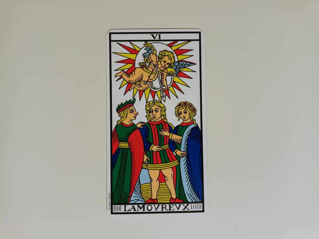 La carte de l’Amoureux implique une interaction entre deux ou plusieurs personnages. Dans le Tarot de Marseille ces personnages sont au nombre de trois. Certains l’interprètent comme une sorte de « triangle amoureux »: un homme qui hésite entre deux femmes. D’autres y voient une figure féminine plus âgée d’un côté (qui pourrait être la mère qui se mêle du choix amoureux de son fils) et de l’autre, la jeune femme qui serait l’épouse. Par extension, beaucoup y voient la tierce personne qui s’interpose pour essayer d’influencer les choix pris au sein d’un couple. Bref, la signification de la carte de l’Amoureux n’est pas totalement élucidée et l’on peut y mettre l’interprétation de notre choix, en fonction des situations. Parfois cela peut vouloir dire ouvrir le coupe à l’interaction avec d’autres personnes. Et parfois cela n’aura rien à voir avec le couple. Toutefois, la plupart du temps cette carte est en rapport avec le domaine relationnel.