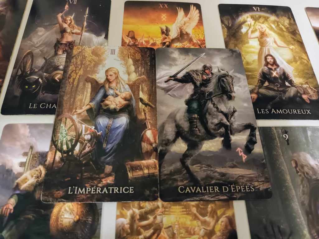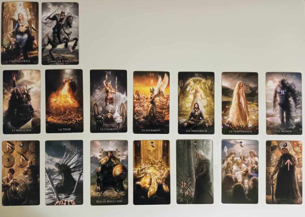 Ici dans le Tarot des Runes, il n’y a que deux personnages et la carte s’appelle « Les Amoureux », alors je vais choisir d’interpréter cela comme l’indice plus classique d’une relation affective (ou de toute autre relation entre deux personnes qui impliquerait une forte charge émotionnelle.