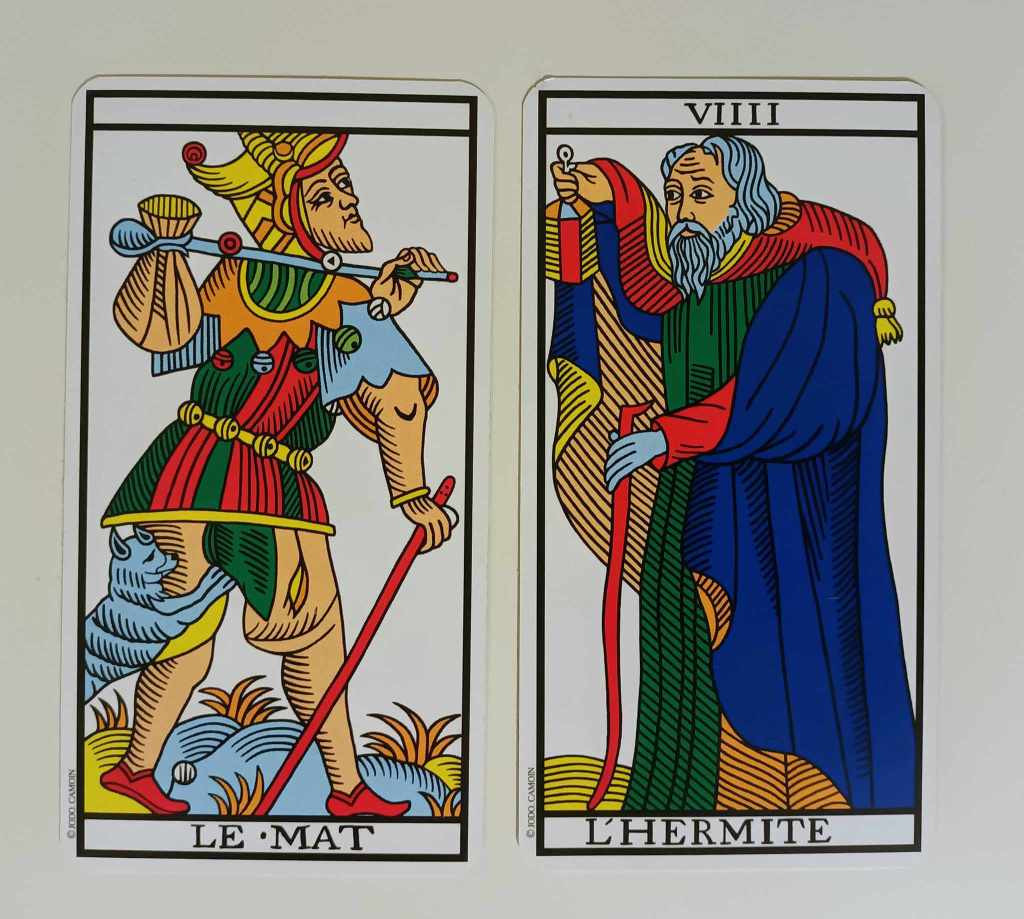 L’Hermite n’avance pas d’un pas aussi pressé, léger et enjoué que le Mat. Il a fait des choix et il assume les conséquences de ses choix. Il a pris ses responsabilités et sa lanterne symbolise le recul qu’il est en train de prendre par rapport aux événements passés. Il va se baser sur ses expériences et sa nouvelle compréhension pour avancer. Là où le Mat se précipite ne sachant où il va, l’Hermite avance prudemment mais surement car il sait d’où il vient et il a de ce fait une meilleure idée de d’endroit où il se dirige.
